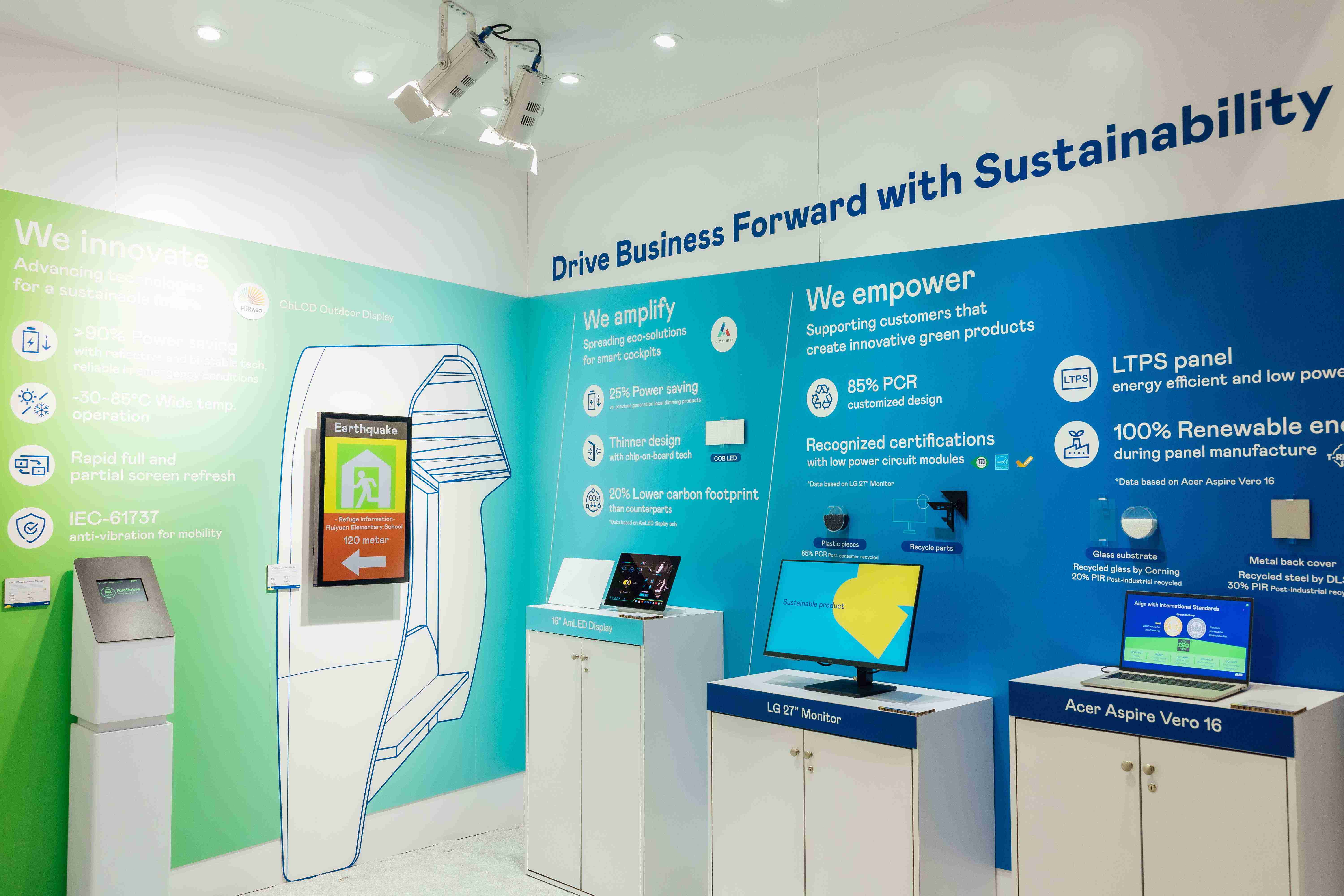 糖果派对运用创新显示技术HiRaso胆固醇液晶双稳态技术达到显示零耗能、、扩大节能省电的AmLED显示技术应用于车用产品、、以再生的消费后回收(PCR)塑料及全绿电生产之面板,,应用于笔电及萤幕,,,增加绿色价值。。