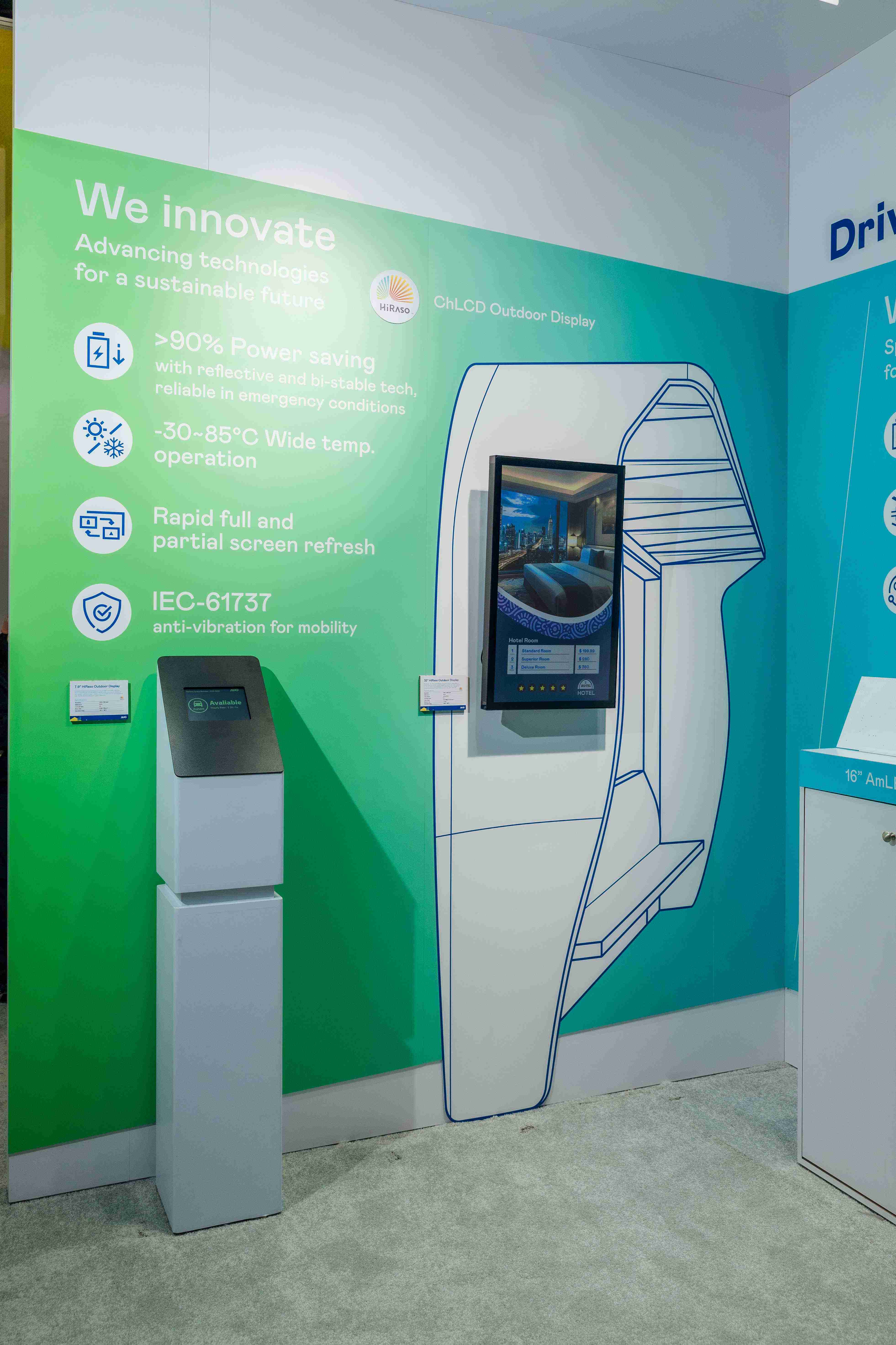 HiRaso胆固醇液晶显示器运用反射环境光线的方式,,,呈现影像显示时零耗能的环保省电诉求,,,,光线愈强愈能呈现绝佳的色彩饱和度及显示效果,,,,同时在摄氏-30度至85度间宽温的使用优势,,为户外电子看板的新首选。。