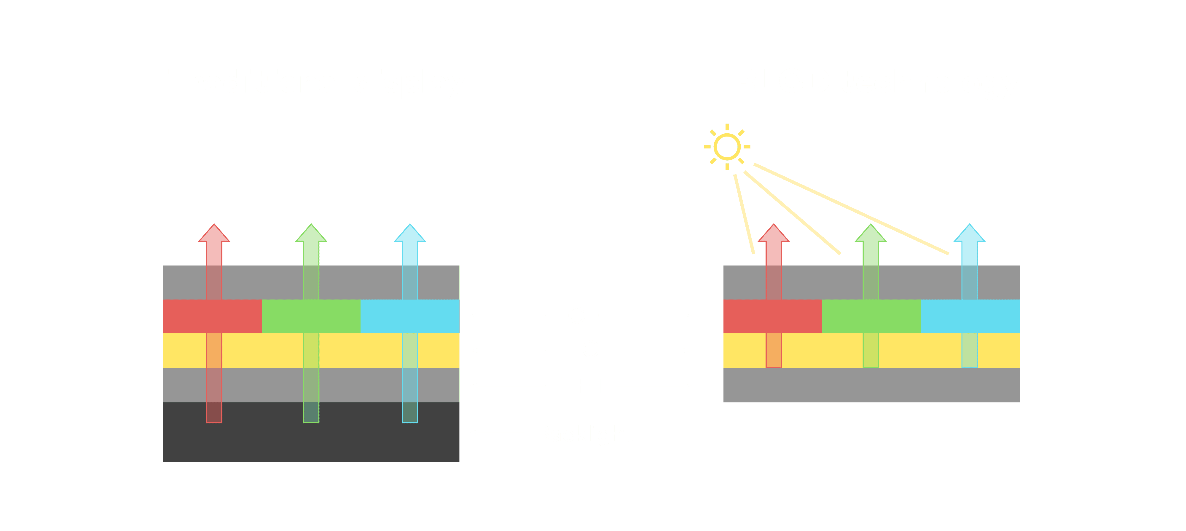 与传统需搭配背光单元的液晶显示相比,,,反射式液晶技术不仅更省电、、更轻薄,,,且即便在艳阳下仍能清晰显示。。。此外,,,少了背光单元,,也大幅降低了 LED 蓝光伤害眼睛的疑虑。。。。