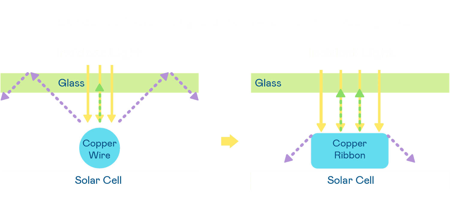 • 电池使用多条铜导线 (Copper wire) 于电池片上形成较短的电流路径,,,,提高电流收集效率,,采用圆形设计的铜导线较传统扁平式的铜焊带 (Ribbon),,,,可增加入射至电池的光线量。。。